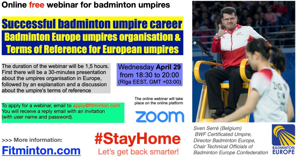 The Latvian Badminton Federation and Badminton Europe invite you to participate invite you to participate in the online free webinar “Successful badminton umpire career – Badminton Europe umpires organisation & Terms of Reference for European umpires”.